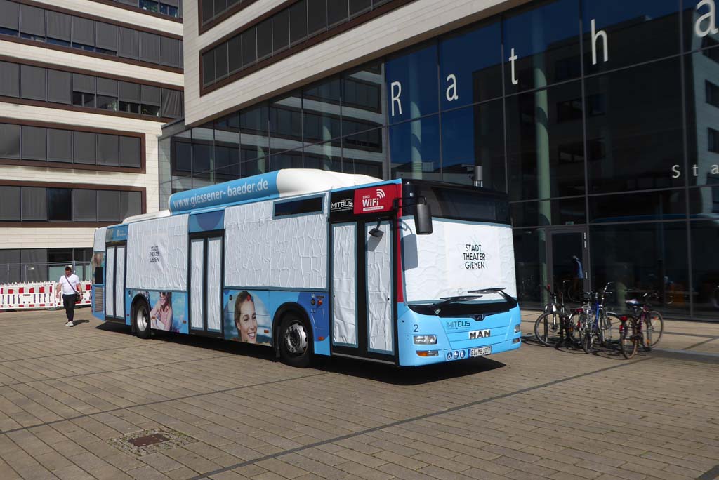 Im Juni 2025 diente Wagen 2 auf dem Berliner Platz vor dem Rathaus als Theaterbühne. In dem Bus wurde das Stück "Etwas kommt mir bekannt vor" von Allex. Fassberg aufgeführt. Das Stück spielt in einem Nachtbus, weswegen alle Fenster mit von innen schwarzer Folie abgedeckt wurden. Das Bild entstand am 11.06.2025.
