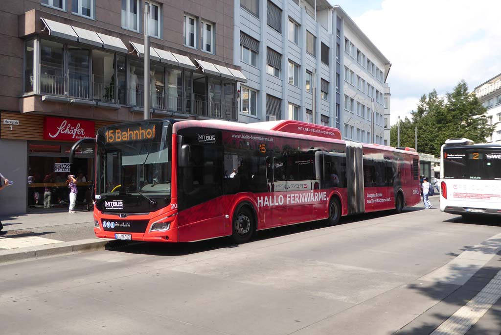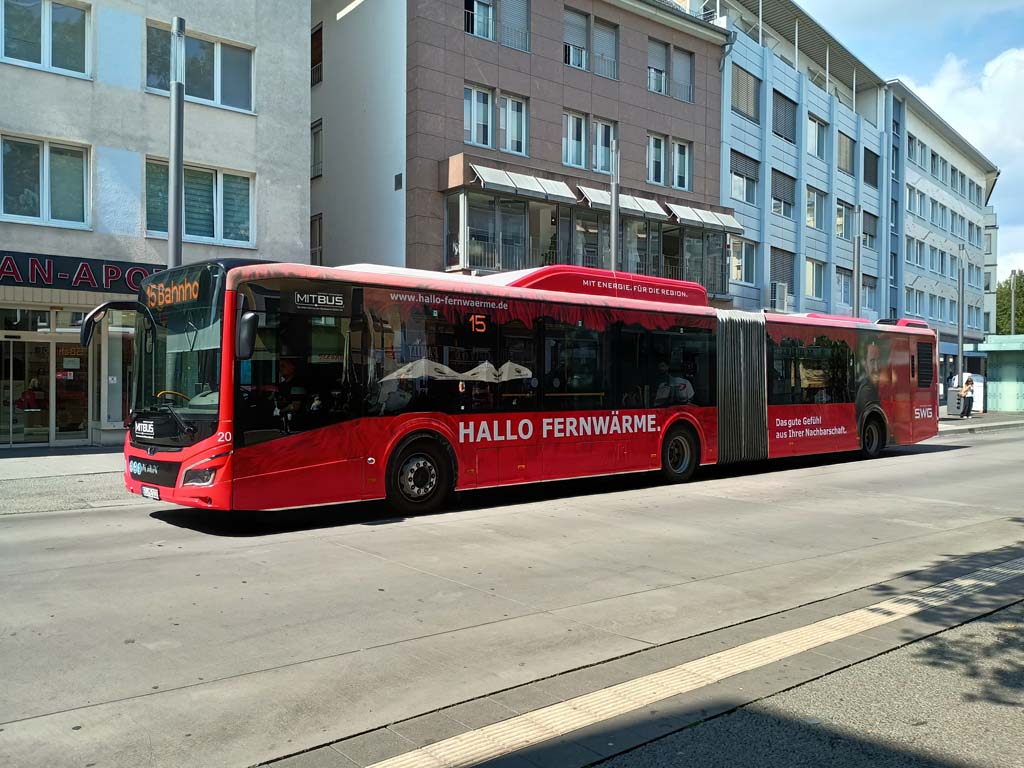 Ende Juli 2025 erhielt Wagen 20 eine neue rote SWG-Eigenwerbung, die dieses Mal für das Fernwärmenetz der Stadtwerke wirbt. Am 01.08.2025 wurde der Bus am Marktplatz aufgenommen.