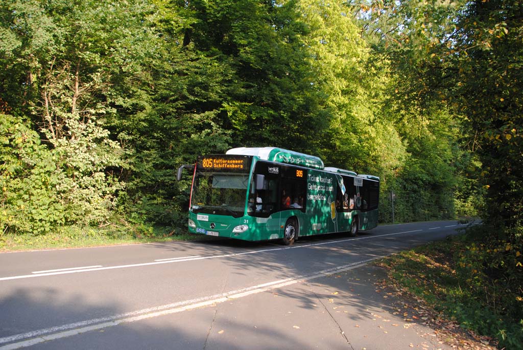 Im Jahr 2025 sind auch Busse der Mit.Bus am Shuttleverkehr vom Parkplatz am Philosophilkum zum Kultursommer auf dem Schiffenberg beteiligt. Am 20.08.2025 bringt Wagen 31 die Konzertbesucher auf den Schiffenberg. Die Bergfahrt wurde jeweils als "Linie 805" beschildert, die Rückfahrt wenige Minuten später dann als "Leerfahrt". Beide Aufnahmen entstanden auf der Zufahrtsstraße zum Schiffenberg.