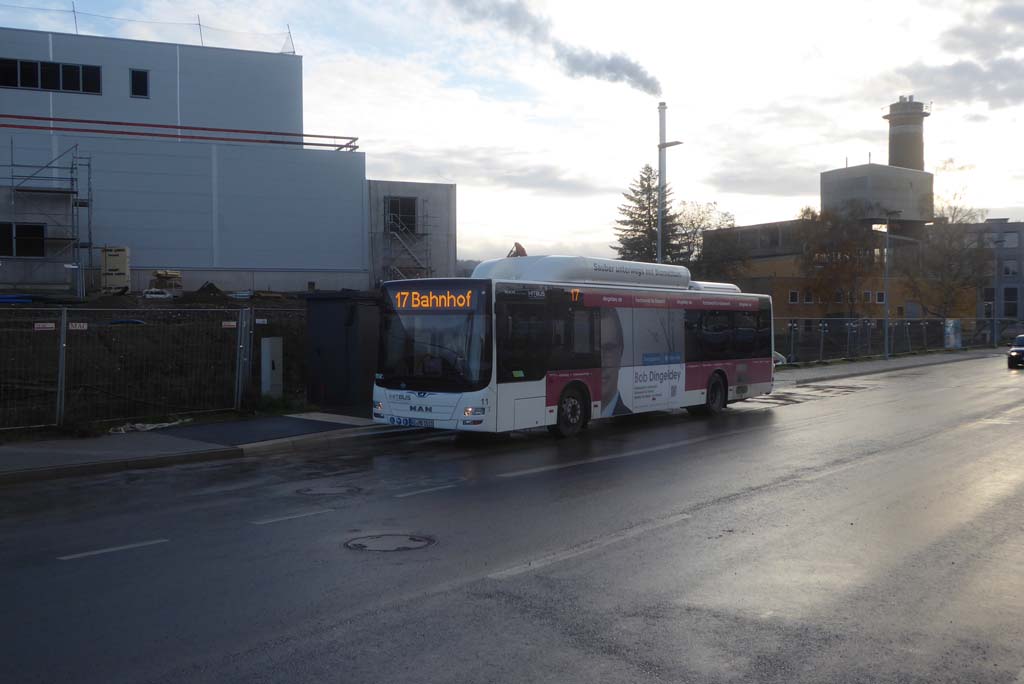 Ab dem Fahrplanwechsel 2022 wird die Linie 17 zur neuen Endhaltestelle "Am alten Flughafen" am Westende der Straße Stolzenmorgen fahren. Am 16.11.2022 nutzte ein Fahrer die Wendepause, um die neue Endhaltestelle sowie den künftigen Linienweg schon einmal zu testen. Oben steht Wagen 11 an der Endhaltestelle, unten wendet er am Kreisverkehrsplatz an der Colemanstraße.
